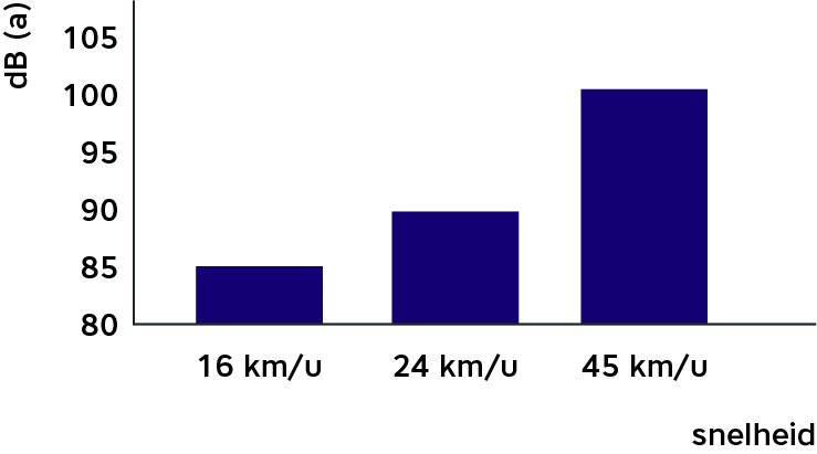 Uit een Amerikaanse studie* kwam naar voren dat zelfs bij 16 km/u fietsen het geluidsniveau al op kan lopen tot zo’n 85 dB. Een paar kilometer harder (24 km/u) en het geluidsniveau kwam uit rond de 90 dB. Rijd je de maximum snelheid op een speed pedelec, dan kun je al snel boven de 100 dB om je oren krijgen. En met 100 dB heb je na minder dan 4 minuten al kans op gehoorschade!